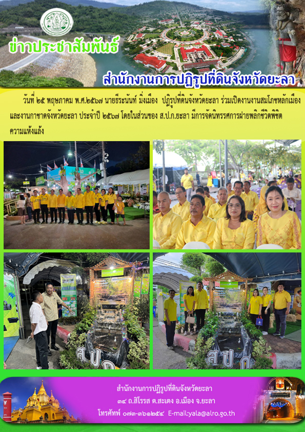 วันที่ 25 พฤษภาคม พ.ศ.2567 นายธีระนันท์ มิ่งเมือง ปฏิรูปที่ดินจังหวัดยะลา ร่วมเปิดงานงานสมโภชหลักเมือง และงานกาชาดจังหวัดยะลา ประจำปี 2567 โดยในส่วนของ ส.ป.ก.ยะลา มีการจัดนิทรรศการฝายพลิกชีวิตพิชิต ความแห้งแล้ง