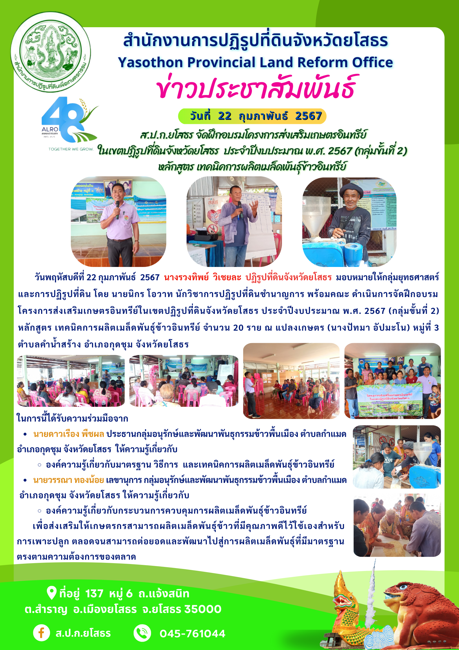 วันพฤหัสบดีที่ 22 กุมภาพันธ์ 2567 นางรวงทิพย์ วิเชยละ ปฏิรูปที่ดินจังหวัดยโสธร มอบหมายให้กลุ่มยุทธศาสตร์และการปฏิรูปที่ดิน โดย นายนิกร โอวาท นักวิชาการปฏิรูปที่ดินชำนาญการ พร้อมคณะ ดำเนินการจัดฝึกอบรมโครงการส่งเสริมเกษตรอินทรีย์ในเขตปฏิรูปที่ดินจังหวัดยโสธร ประจำปีงบประมาณ พ.ศ. 2567 (กลุ่มขั้นที่ 2)หลักสูตร เทคนิคการผลิตเมล็ดพันธุ์ข้าวอินทรีย์ จำนวน 20 ราย ณ แปลงเกษตร (นางปัทมา อัปมะโน) หมู่ที่ 3ตำบลคำน้ำสร้าง อำเภอกุดชุม จังหวัดยโสธร