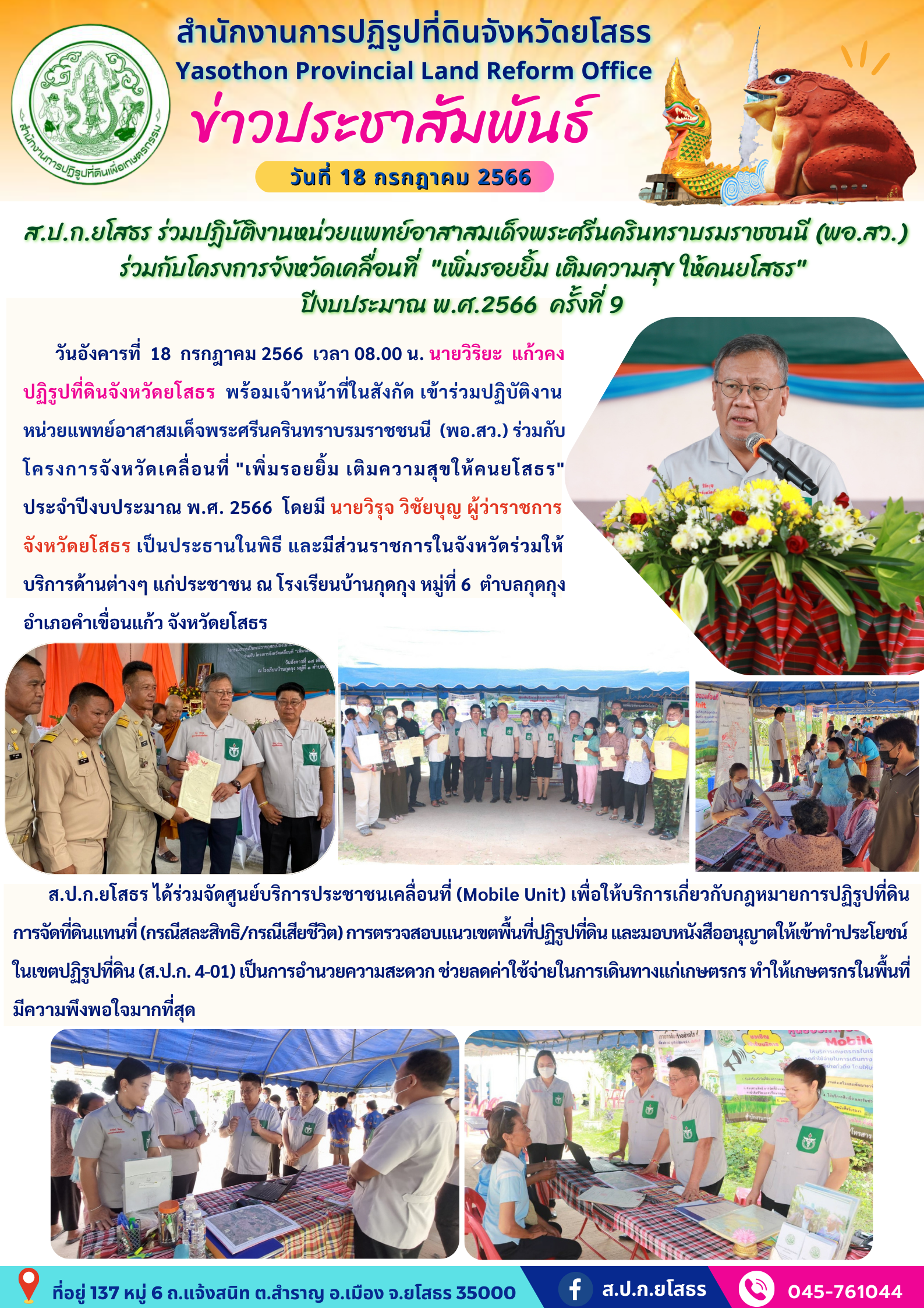 ส.ป.ก.ยโสธร ได้ร่วมจัดศูนย์บริการประชาชนเคลื่อนที่ (Mobile Unit) เพื่อให้บริการเกี่ยวกับกฎหมายการปฏิรูปที่ดินการจัดที่ดินแทนที่ (กรณีสละสิทธิ/กรณีเสียชีวิต) การตรวจสอบแนวเขตพื้นที่ปฏิรูปที่ดิน และมอบหนังสืออนุญาตให้เข้าทำประโยชน์ในเขตปฏิรูปที่ดิน (ส.ป.ก. 4-01) เป็นการอำนวยความสะดวก ช่วยลดค่าใช้จ่ายในการเดินทางแก่เกษตรกร ทำให้เกษตรกรในพื้นที่มีความพึงพอใจมากที่สุด