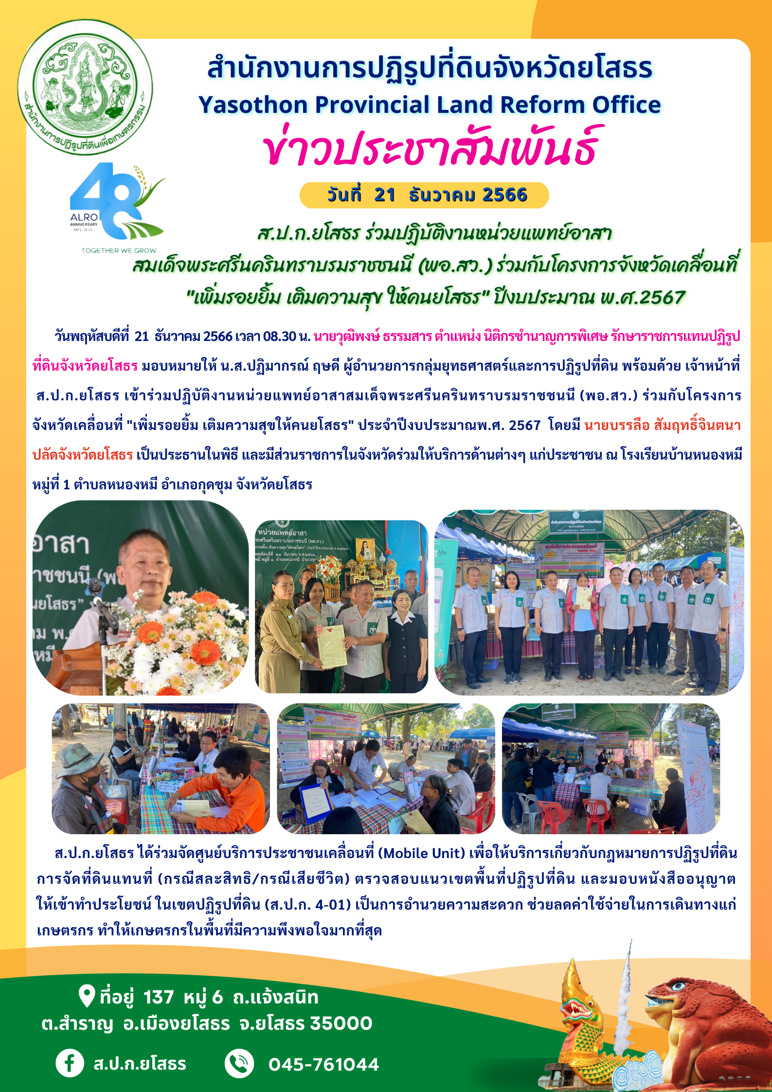 วันพฤหัสบดีที่ 21 ธันวาคม 2566 เวลา 08.30 น. นายวุฒิพงษ์ ธรรมสาร ตำแหน่ง นิติกรชำนาญการพิเศษ รักษาราชการแทนปฏิรูปที่ดินจังหวัดยโสธร มอบหมายให้ น.ส.ปฏิมากรณ์ ฤษดี ผู้อำนวยการกลุ่มยุทธศาสตร์และการปฏิรูปที่ดิน พร้อมด้วย เจ้าหน้าที่ ส.ป.ก.ยโสธร เข้าร่วมปฏิบัติงานหน่วยแพทย์อาสาสมเด็จพระศรีนครินทราบรมราชชนนี (พอ.สว.) ร่วมกับโครงการจังหวัดเคลื่อนที่ "เพิ่มรอยยิ้ม เติมความสุขให้คนยโสธร" ประจำปีงบประมาณพ.ศ. 2567 โดยมี นายบรรลือ สัมฤทธิ์จินตนา ปลัดจังหวัดยโสธร เป็นประธานในพิธี และมีส่วนราชการในจังหวัดร่วมให้บริการด้านต่างๆ แก่ประชาชน ณ โรงเรียนบ้านหนองหมี หมู่ที่ 1 ตำบลหนองหมี อำเภอกุดชุม จังหวัดยโสธร
