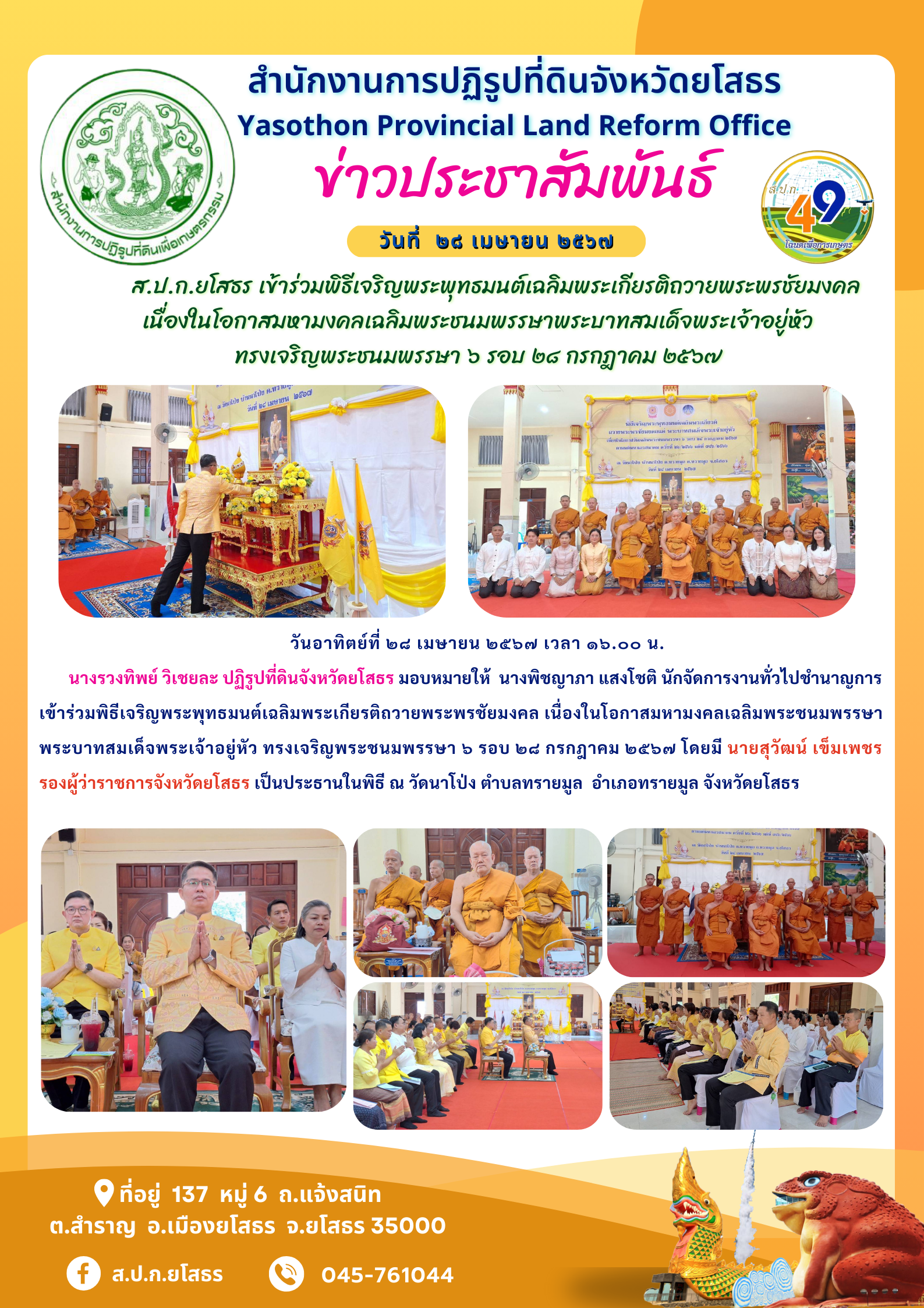 วันอาทิตย์ที่ ๒๘ เมษายน ๒๕๖๗ เวลา ๑๖.๐๐ น. นางรวงทิพย์ วิเชยละ ปฏิรูปที่ดินจังหวัดยโสธร มอบหมายให้ นางพิชญาภา แสงโชติ นักจัดการงานทั่วไปชำนาญการ เข้าร่วมพิธีเจริญพระพุทธมนต์เฉลิมพระเกียรติถวายพระพรชัยมงคล เนื่องในโอกาสมหามงคลเฉลิมพระชนมพรรษาพระบาทสมเด็จพระเจ้าอยู่หัว ทรงเจริญพระชนมพรรษา ๖ รอบ ๒๘ กรกฎาคม ๒๕๖๗ โดยมี นายสุวัฒน์ เข็มเพชร รองผู้ว่าราชการจังหวัดยโสธร เป็นประธานในพิธี ณ วัดนาโป่ง ตำบลทรายมูล อำเภอทรายมูล จังหวัดยโสธร