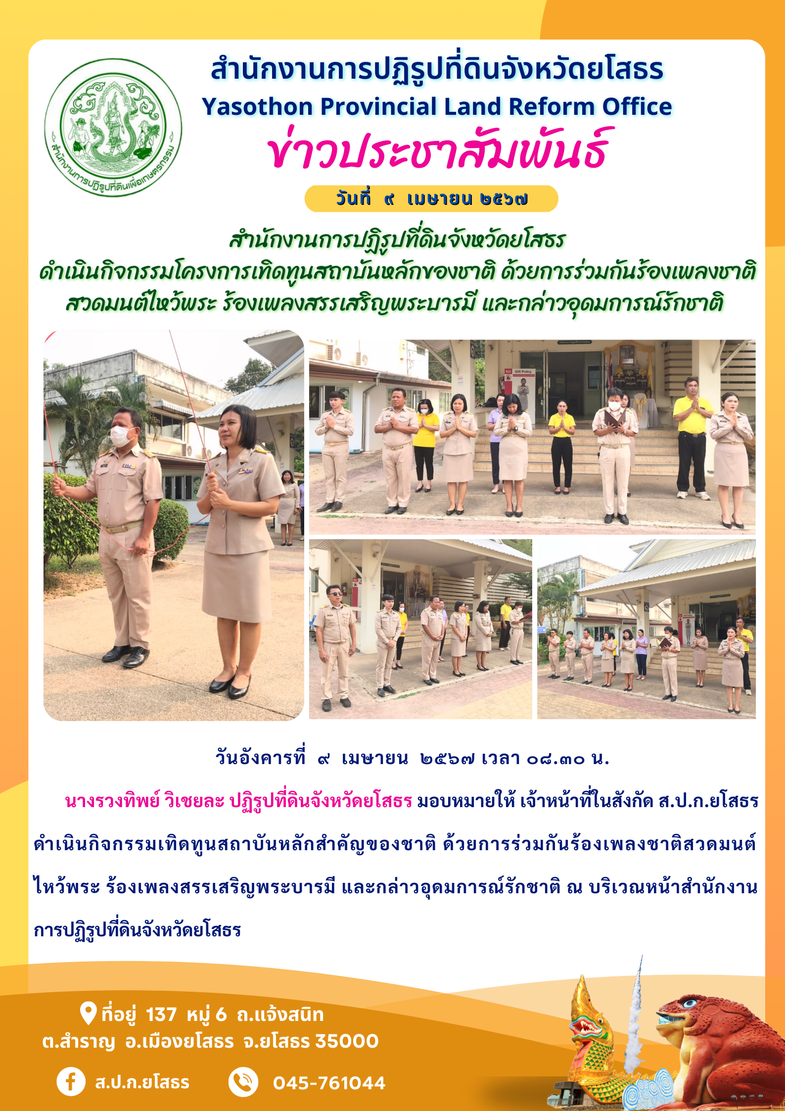 วันอังคารที่ ๙ เมษายน ๒๕๖๗ เวลา ๐๘.๓๐ น. นางรวงทิพย์ วิเชยละ ปฏิรูปที่ดินจังหวัดยโสธร มอบหมายให้ เจ้าหน้าที่ในสังกัด ส.ป.ก.ยโสธร ดำเนินกิจกรรมเทิดทูนสถาบันหลักสำคัญของชาติ ด้วยการร่วมกันร้องเพลงชาติสวดมนต์ไหว้พระ ร้องเพลงสรรเสริญพระบารมี และกล่าวอุดมการณ์รักชาติ ณ บริเวณหน้าสำนักงานการปฏิรูปที่ดินจังหวัดยโสธร