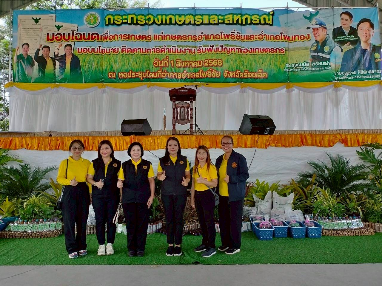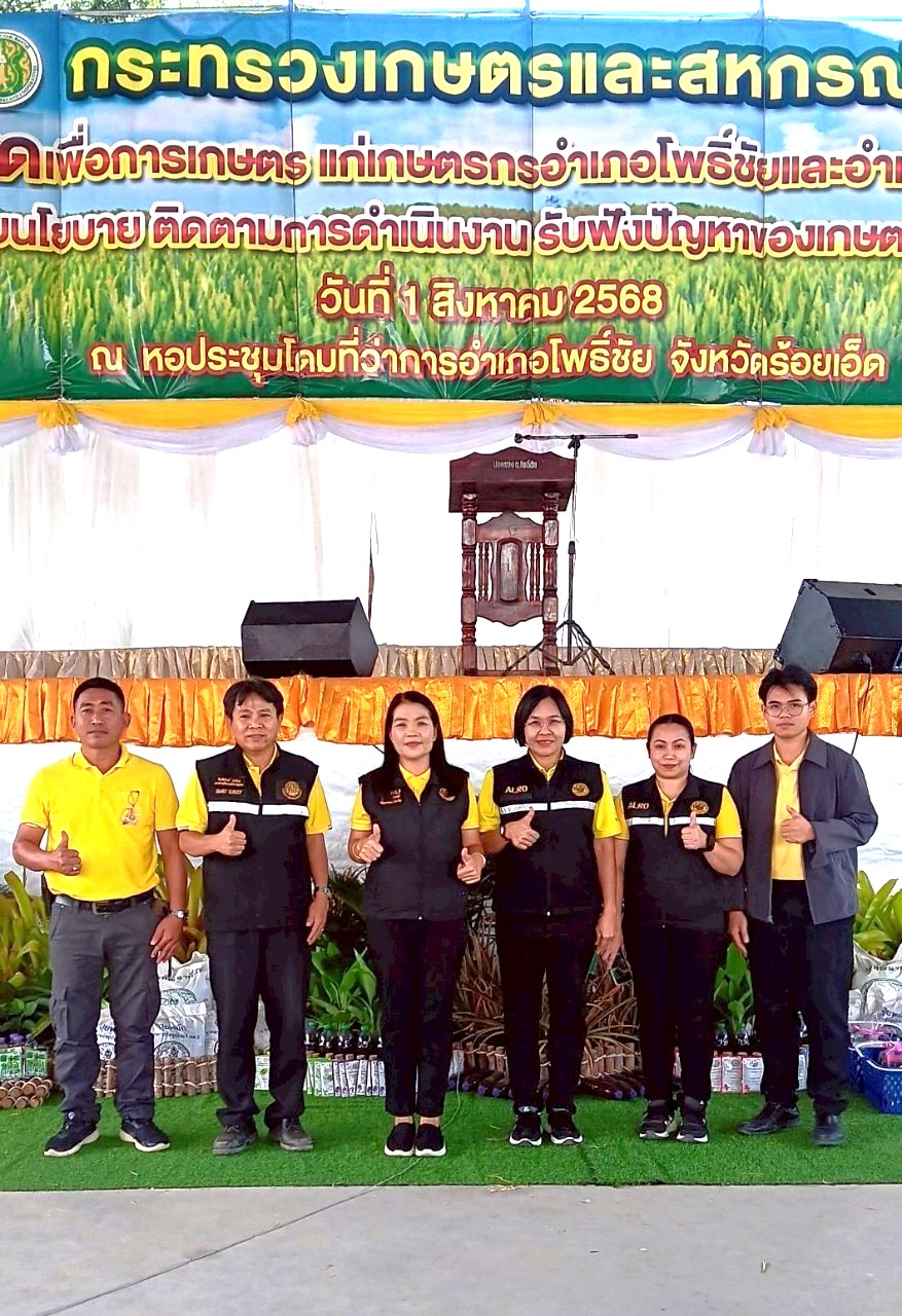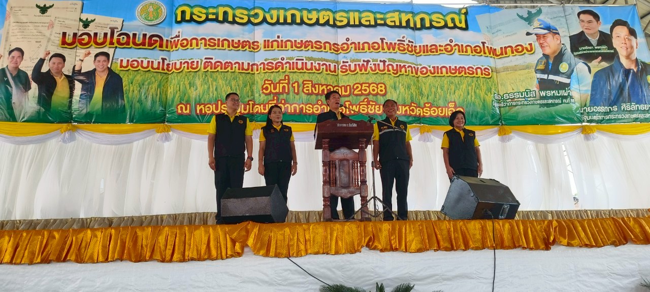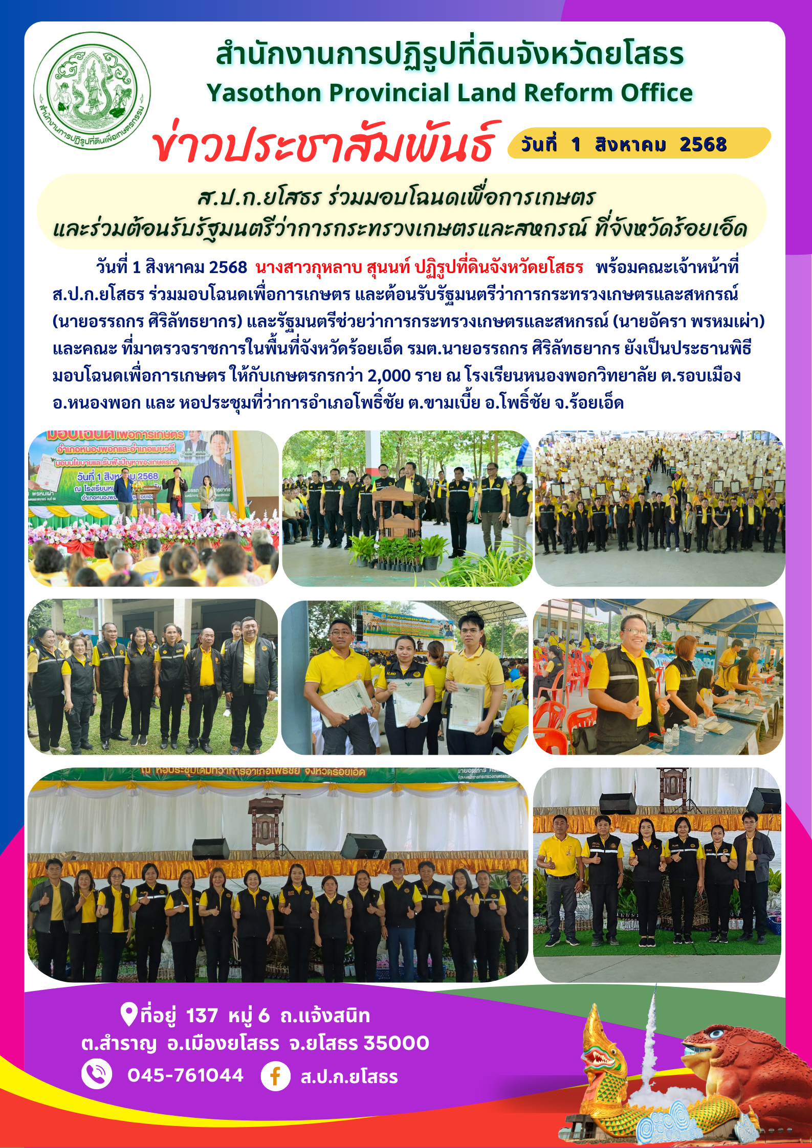วันที่ 1 สิงหาคม 2568 นางสาวกุหลาบ สุนนท์ ปฏิรูปที่ดินจังหวัดยโสธร พร้อมคณะเจ้าหน้าที่ ส.ป.ก.ยโสธร ร่วมมอบโฉนดเพื่อการเกษตร และต้อนรับรัฐมนตรีว่าการกระทรวงเกษตรและสหกรณ์ (นายอรรถกร ศิริลัทธยากร) และรัฐมนตรีช่วยว่าการกระทรวงเกษตรและสหกรณ์ (นายอัครา พรหมเผ่า) และคณะ ที่มาตรวจราชการในพื้นที่จังหวัดร้อยเอ็ด รมต.นายอรรถกร ศิริลัทธยากร ยังเป็นประธานพิธีมอบโฉนดเพื่อการเกษตร ให้กับเกษตรกรกว่า 2,000 ราย ณ โรงเรียนหนองพอกวิทยาลัย ต.รอบเมือง อ.หนองพอก และ หอประชุมที่ว่าการอำเภอโพธิ์ชัย ต.ขามเบี้ย อ.โพธิ์ชัย จ.ร้อยเอ็ด